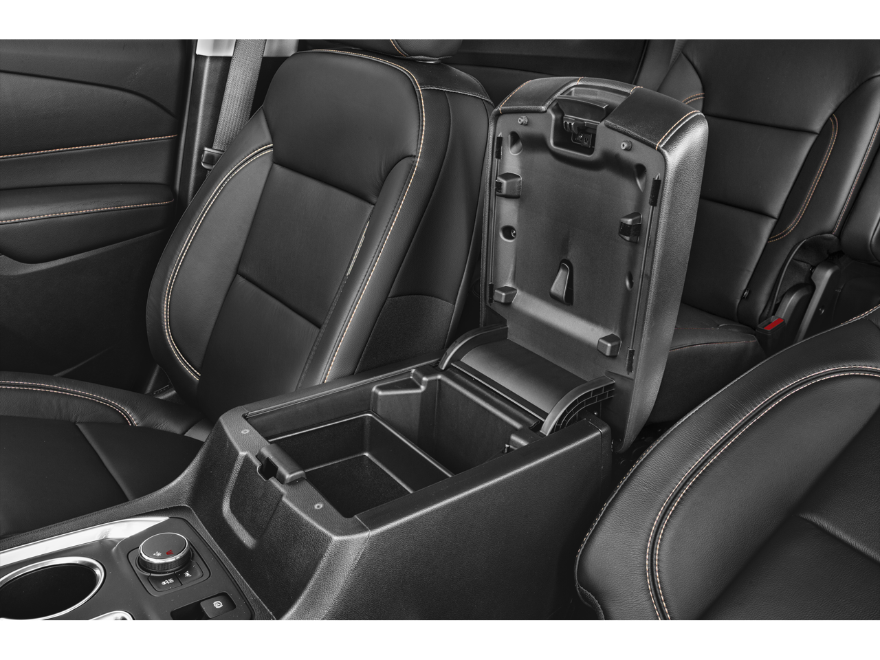 - Console, front center with 2 cup holders, covered storage bin with storage and removable tray